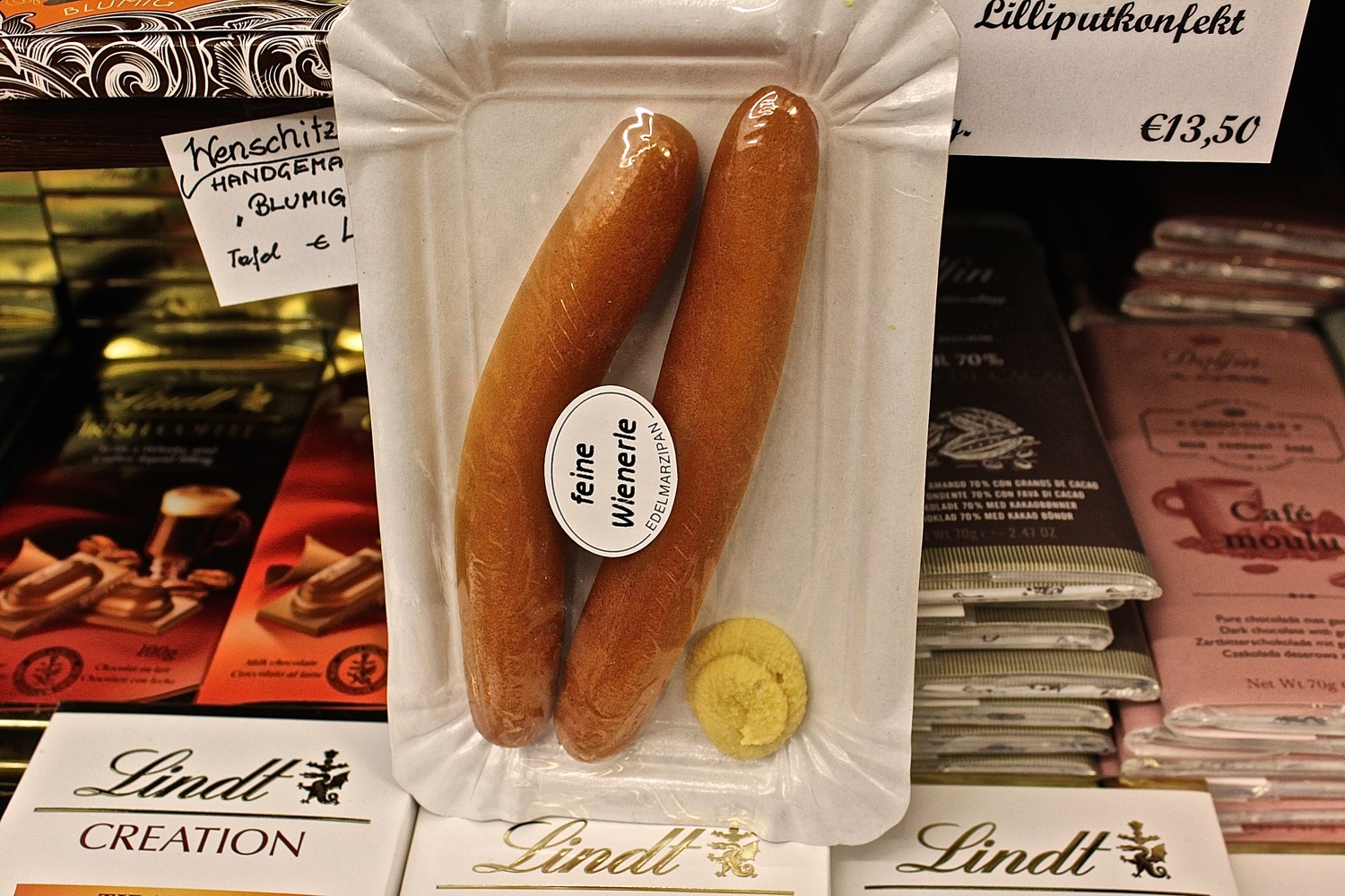 Австрийский шоколад очень вкусный, и он есть с разными наполнителями - сало, ром, коньяк, конопля и многое чего еще. Есть магазинчик, где очень большрй выбор и есть интересные и необычные изделия из марципана.